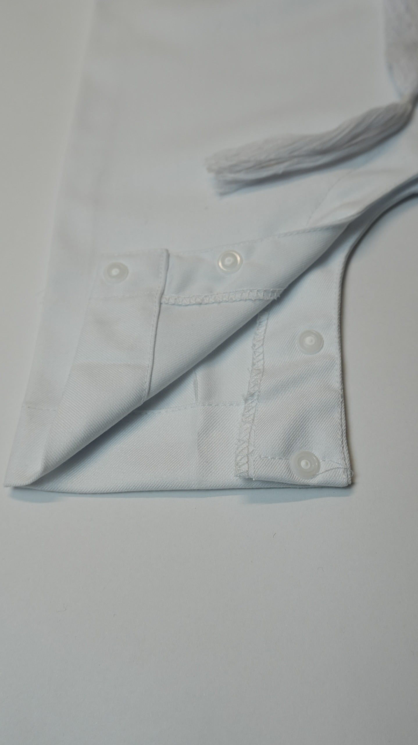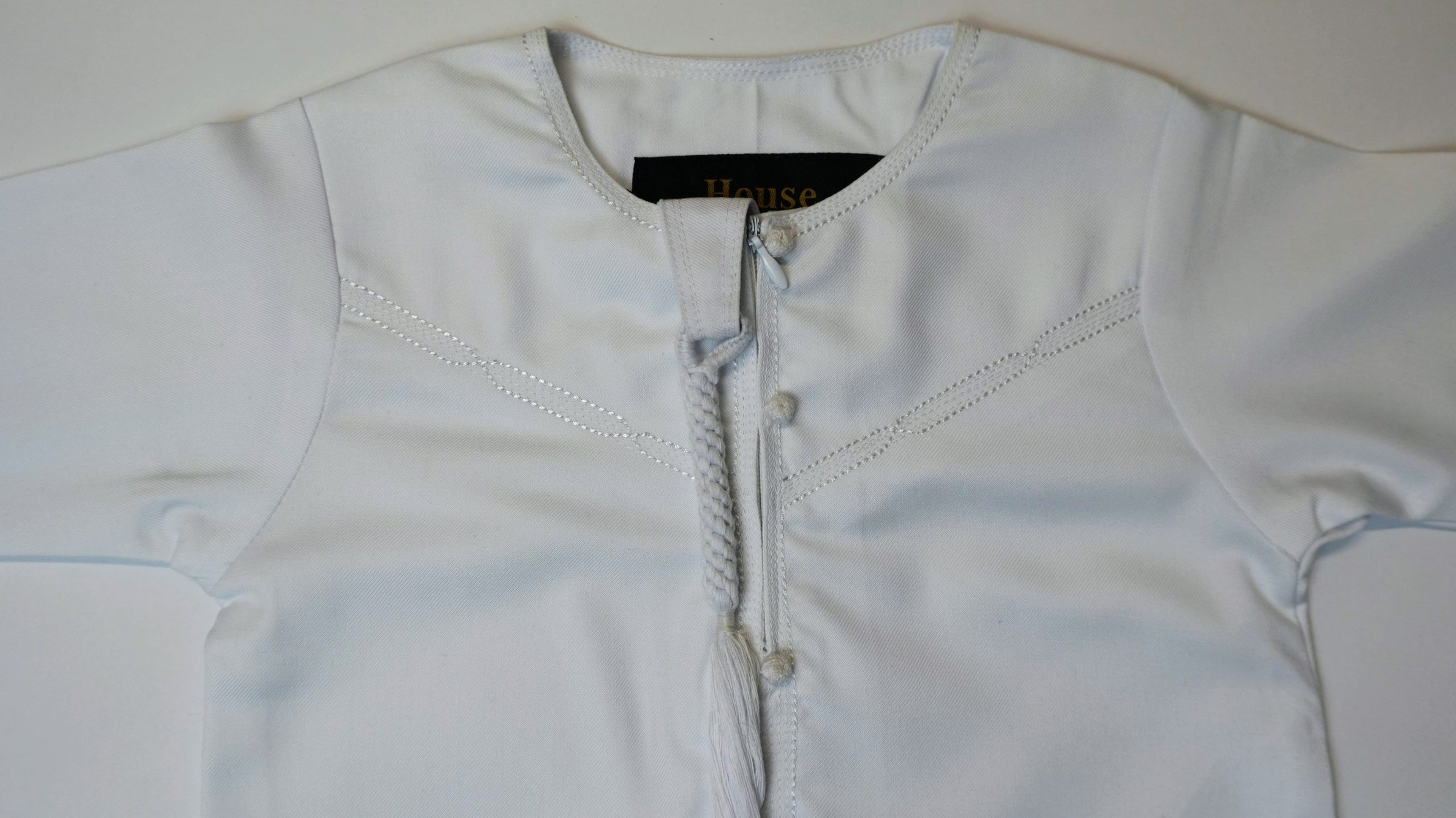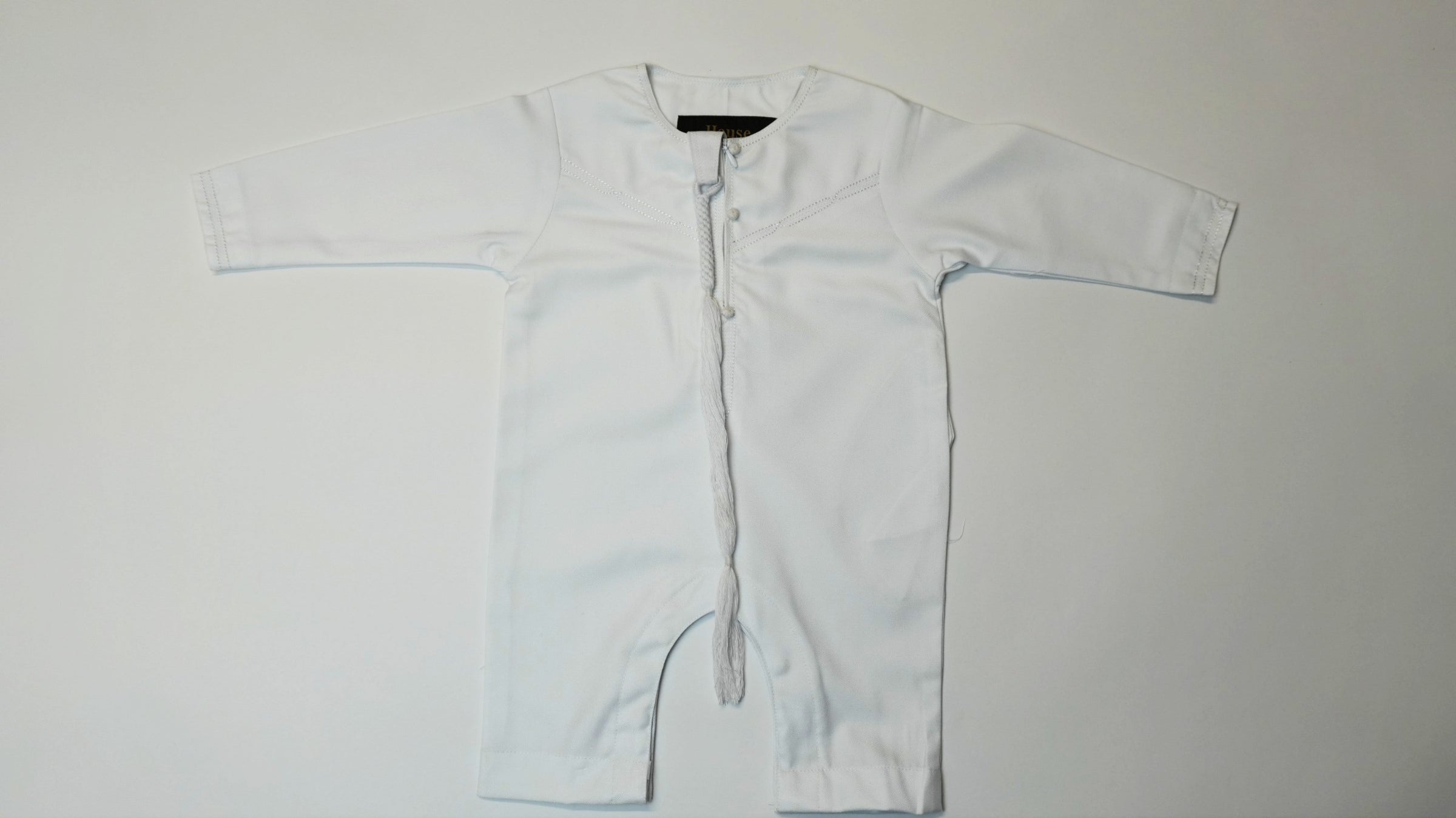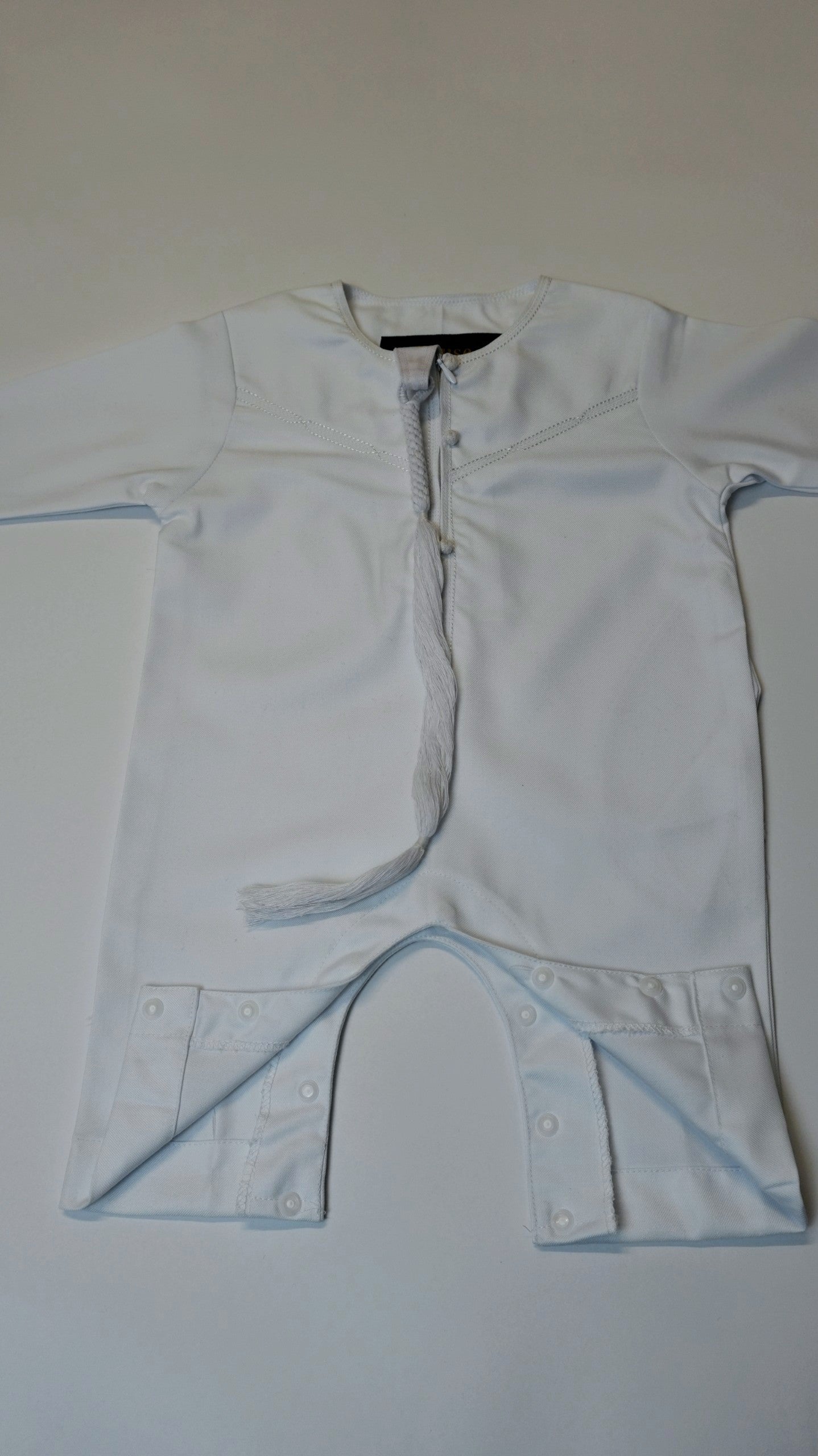 White Emirati baby romper thobe featuring a convenient chest zip, two side pockets, and removable tassel. Made from polyester viscose blend for comfort and durability. Perfect for special occasions or everyday wear.