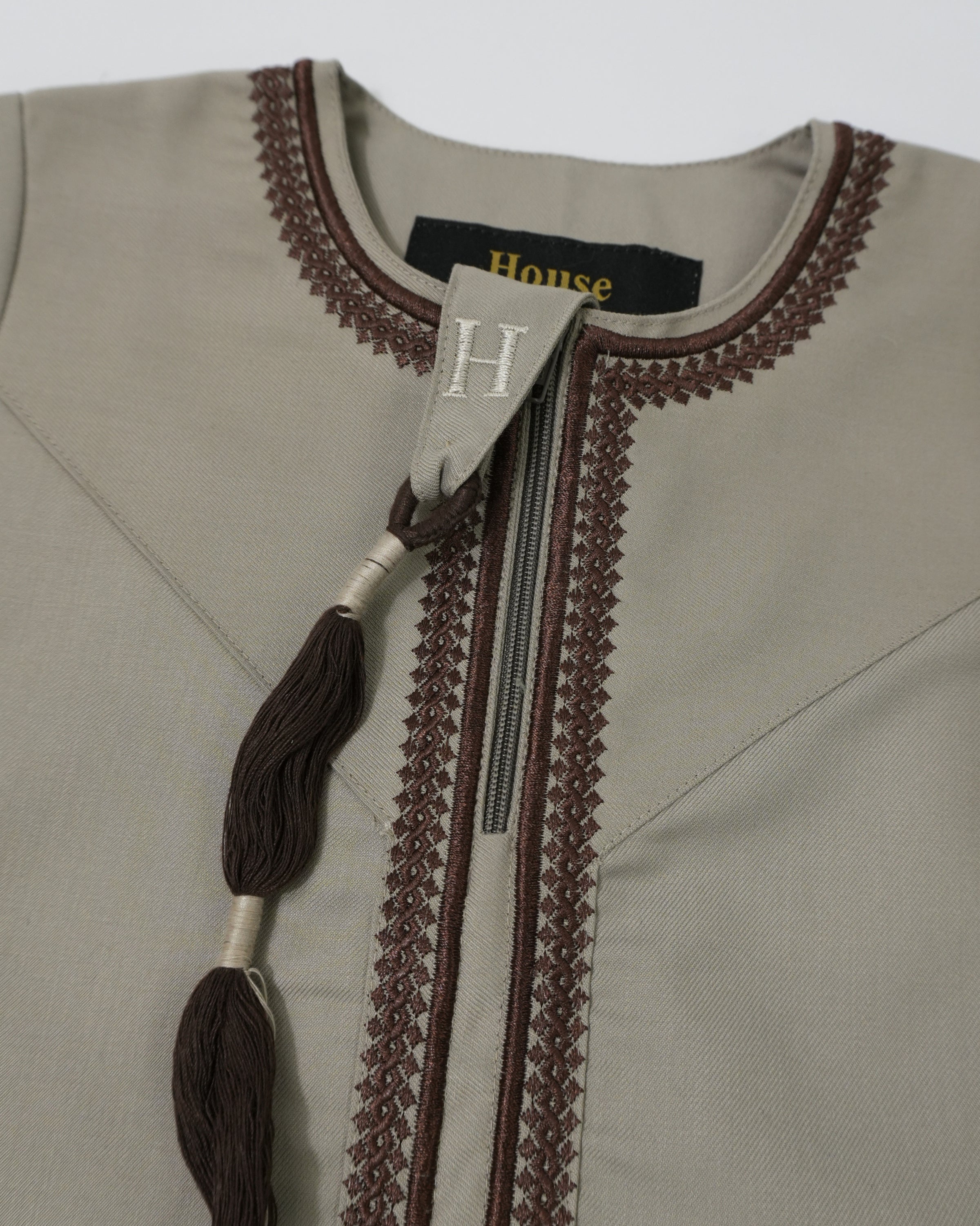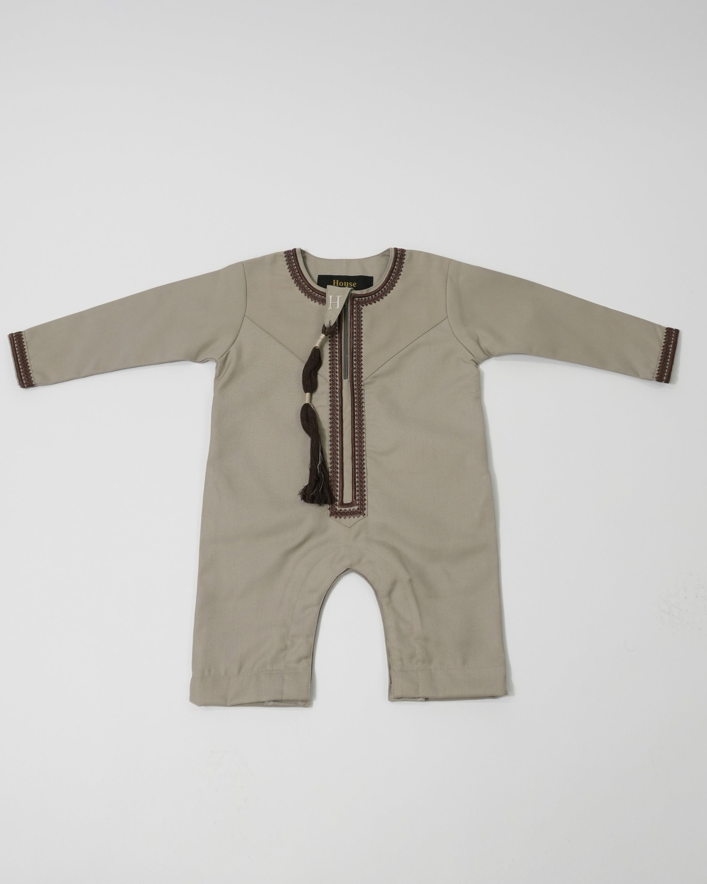 Beige Embroidered Omani baby romper thobe featuring a convenient chest zip, two side pockets, and removable tassel. Made from polyester viscose blend for comfort and durability. Perfect for special occasions or everyday wear.