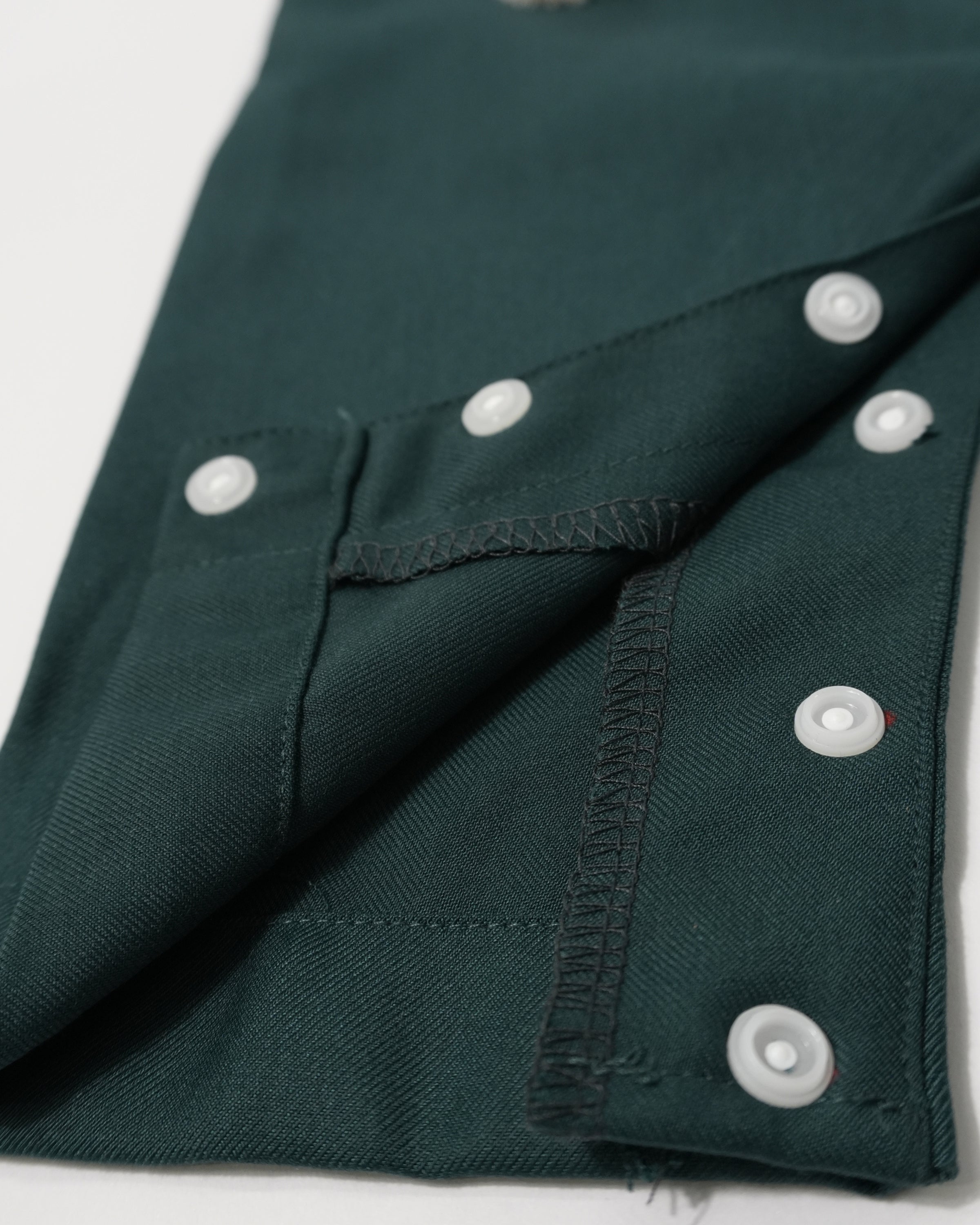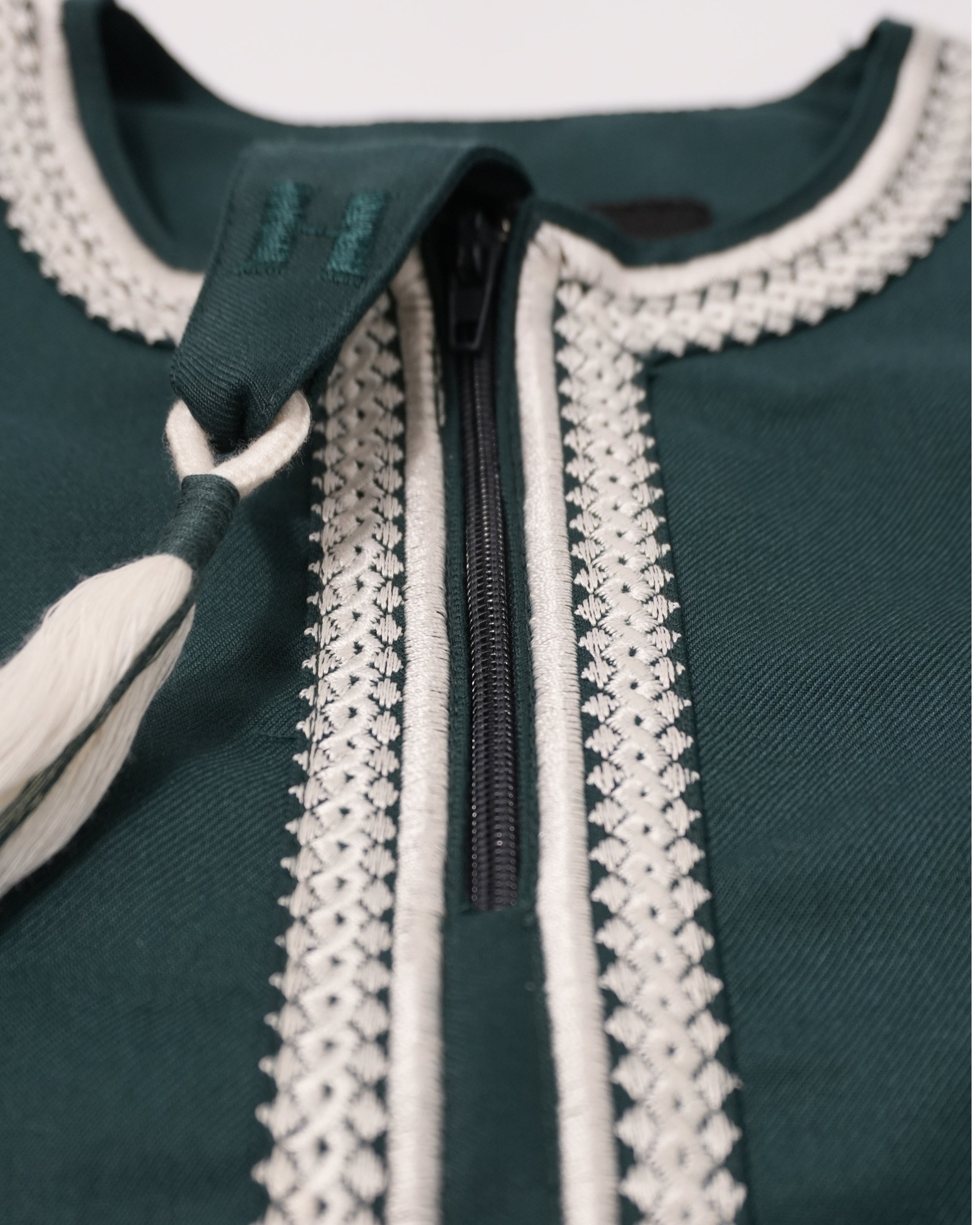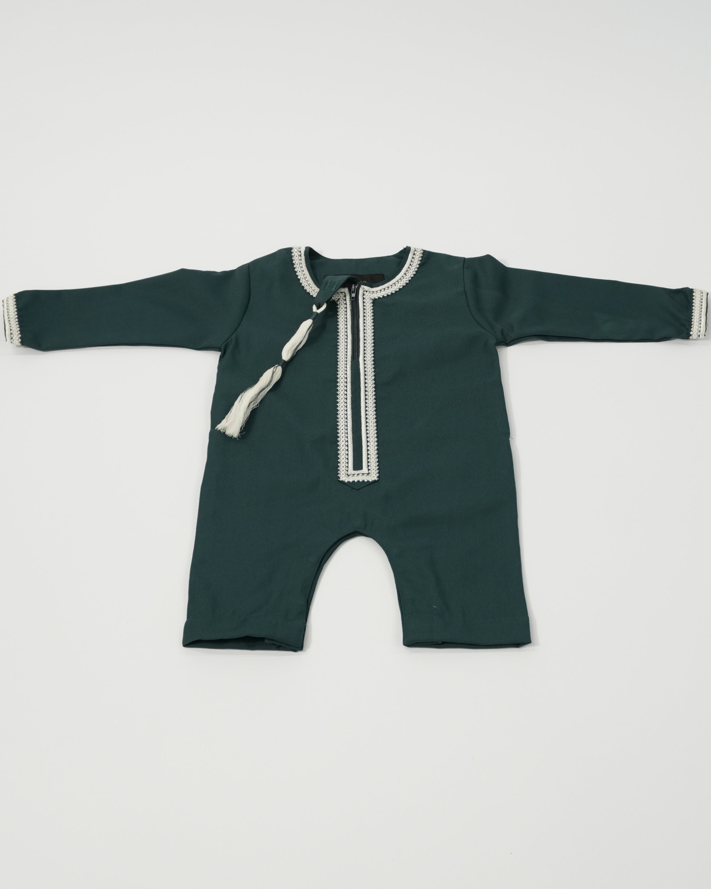 Opal Green Embroidered Omani baby romper thobe featuring a convenient chest zip, two side pockets, and removable tassel. Made from polyester viscose blend for comfort and durability. Perfect for special occasions or everyday wear.