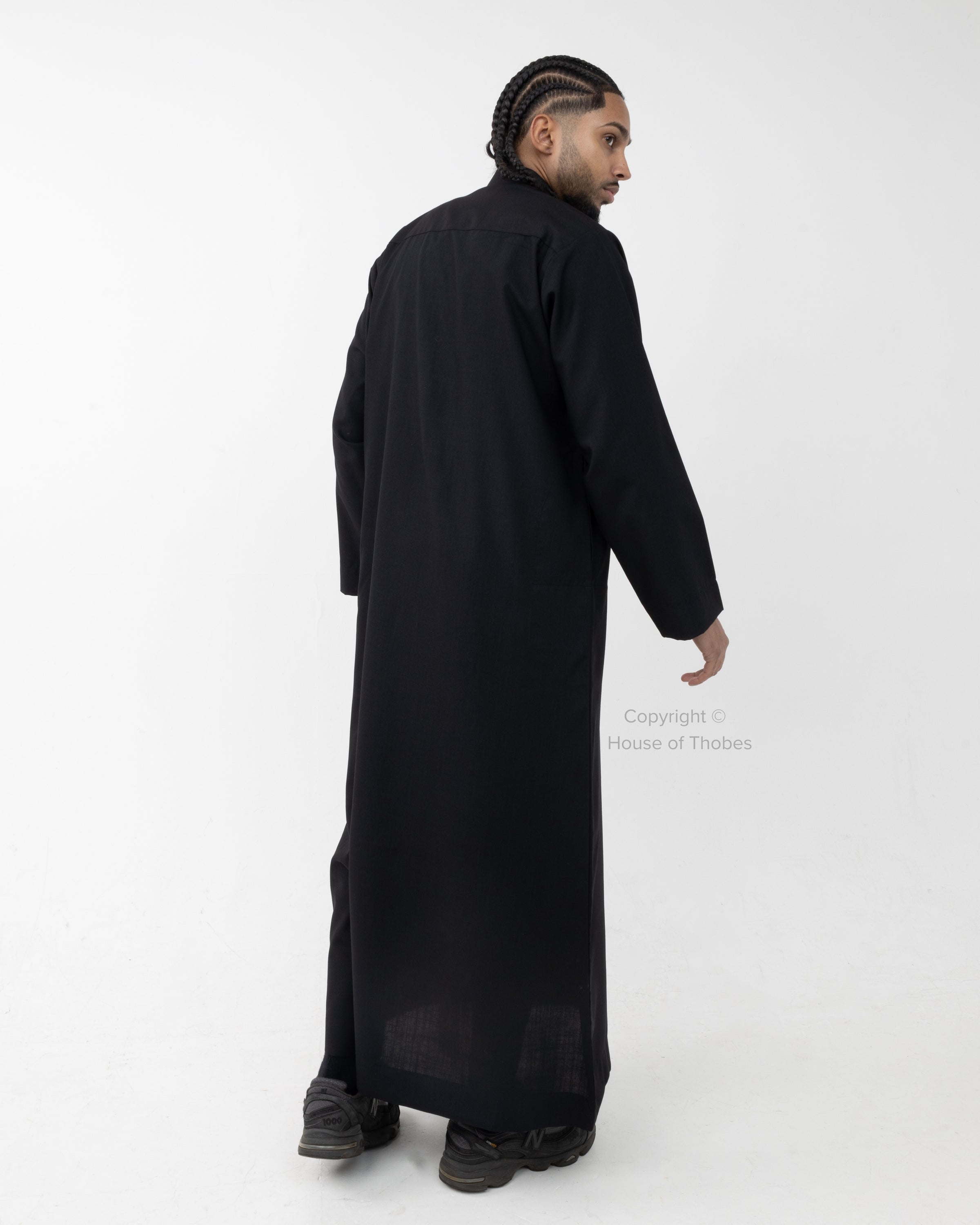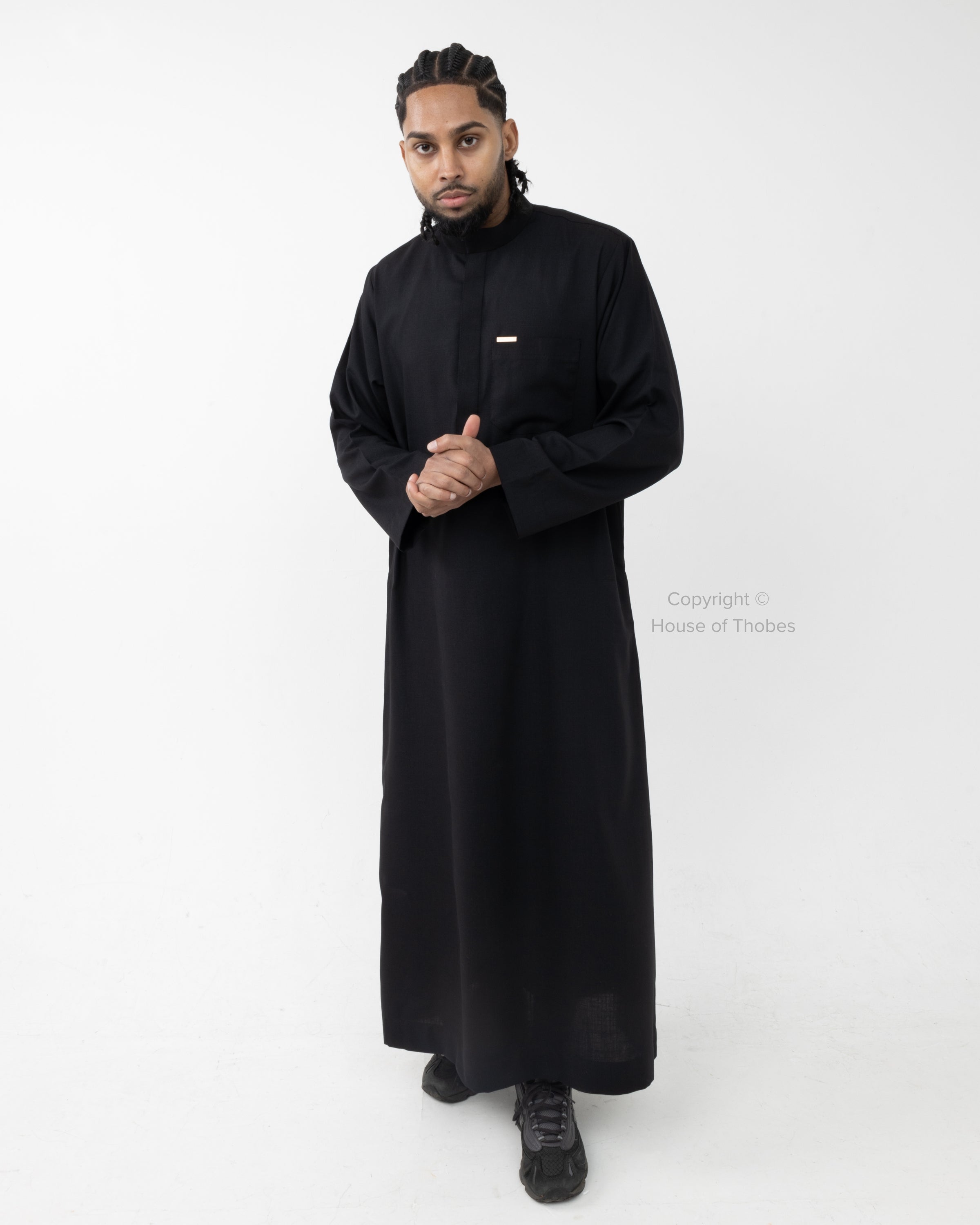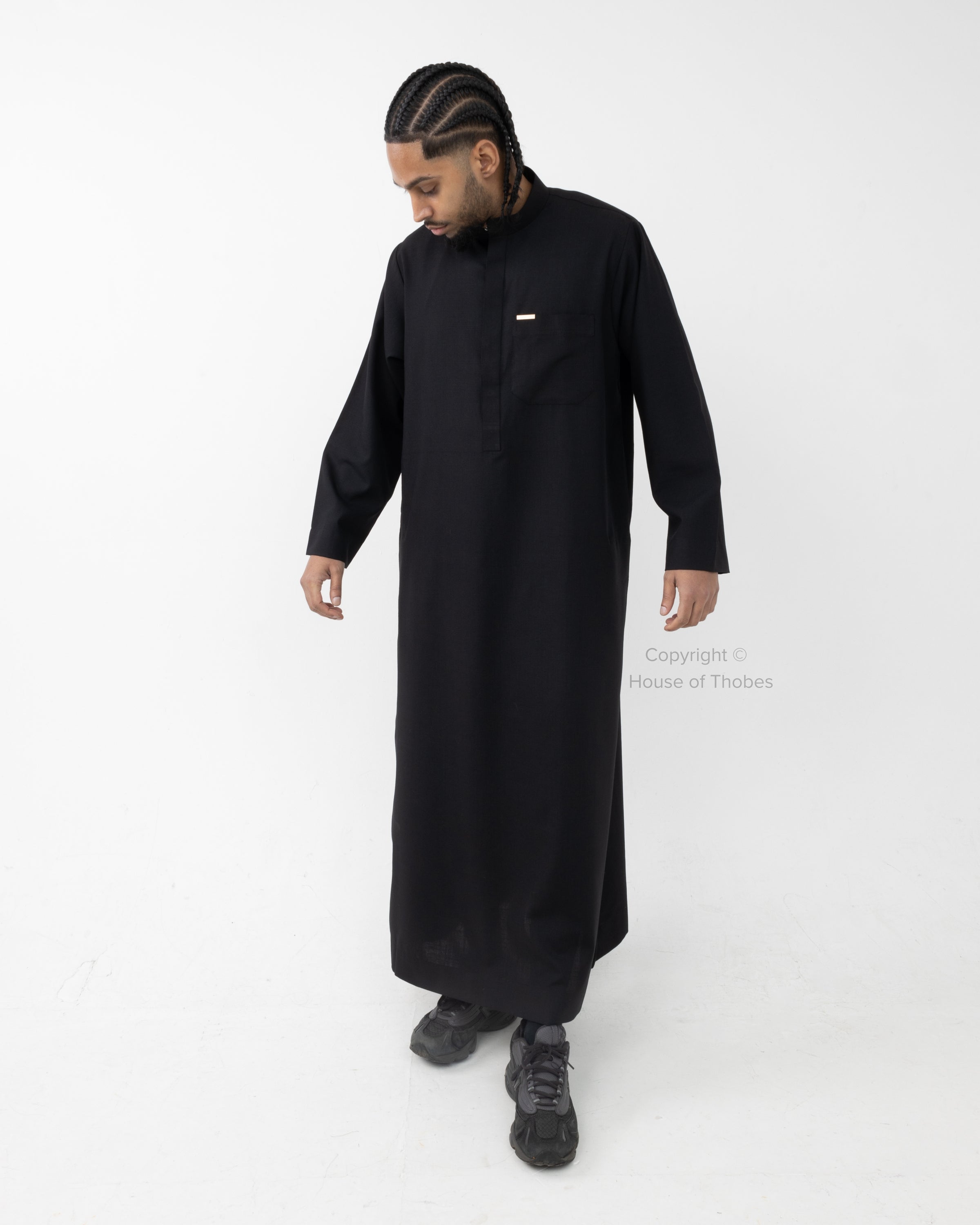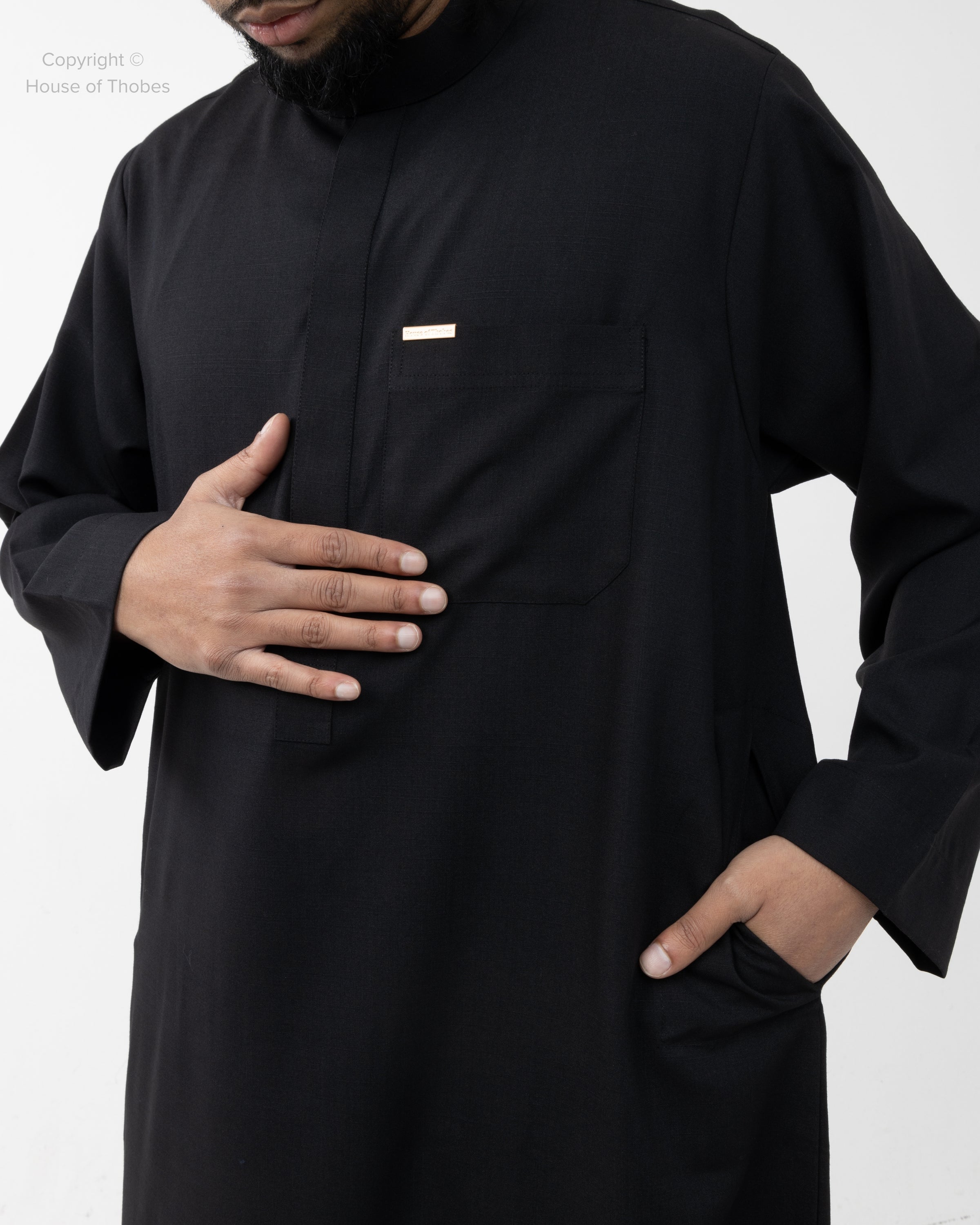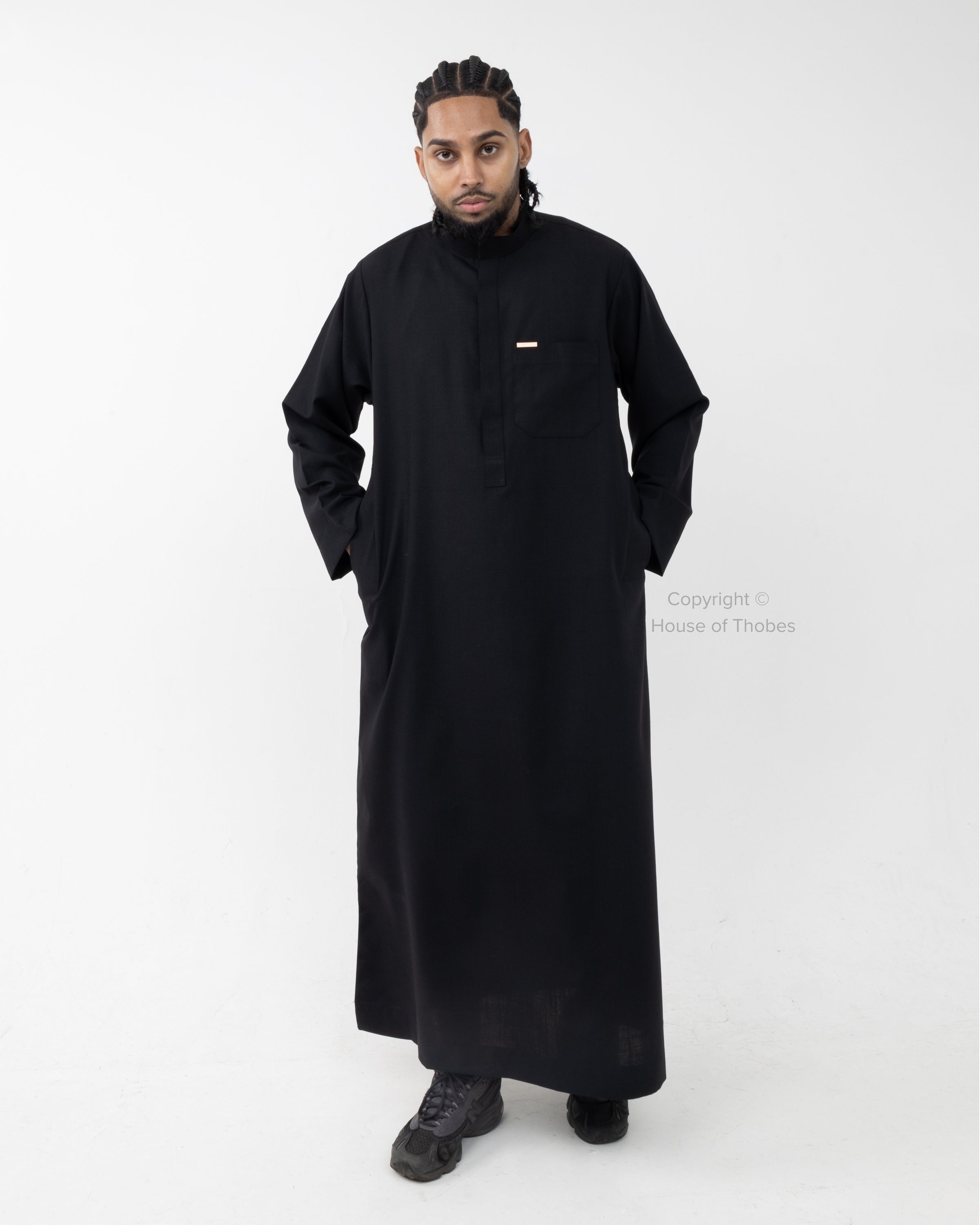This Luxury Black Thobe features a classic Kuwaiti Collar design with hidden buttons. The thobe includes open sleeves, two side pockets and a front pocket for practical everyday wear. Crafted from Arabic Wool fabric, it offers elegance, comfort and easy maintenance. Please consult our Size Guide if you're uncertain about your fit.