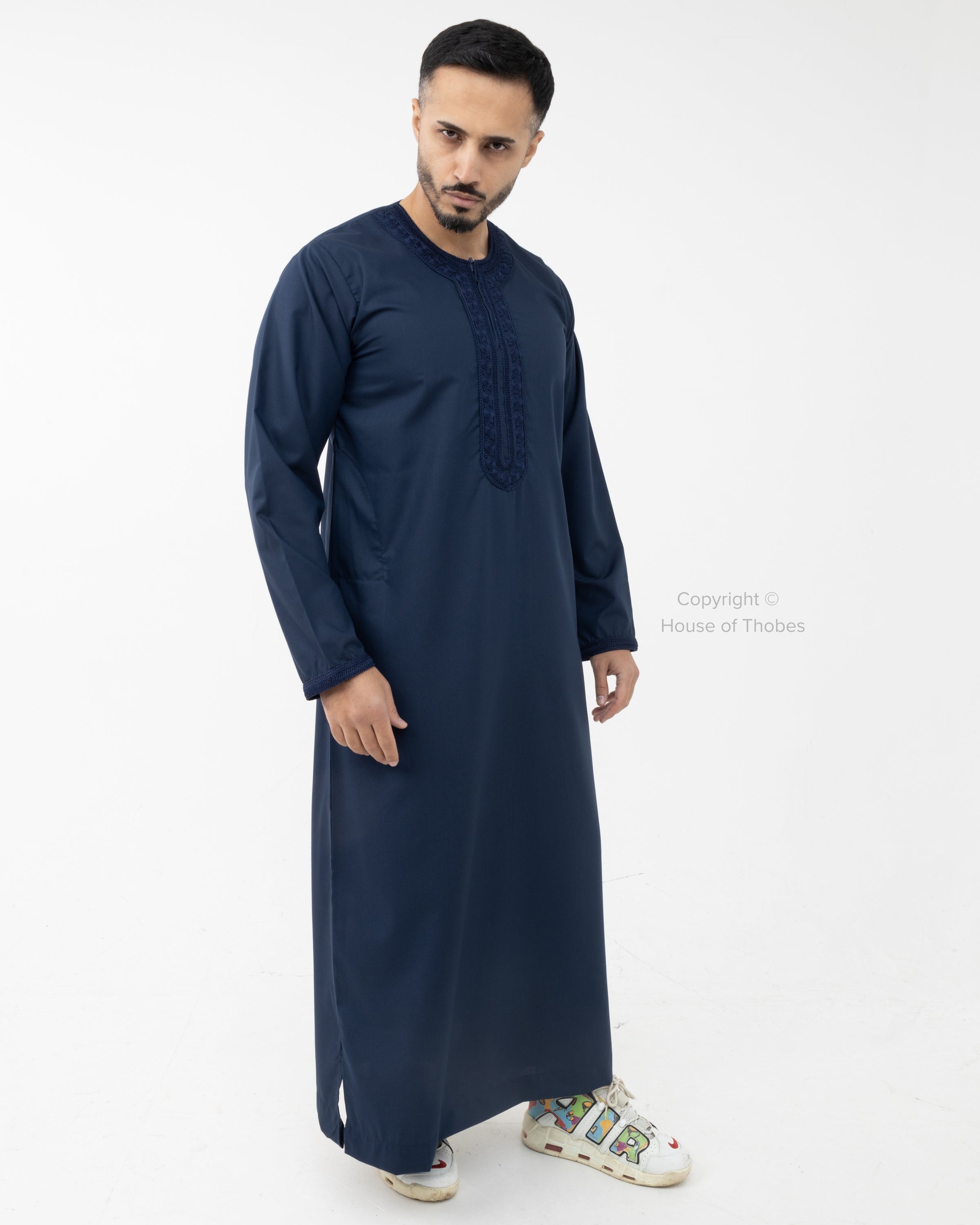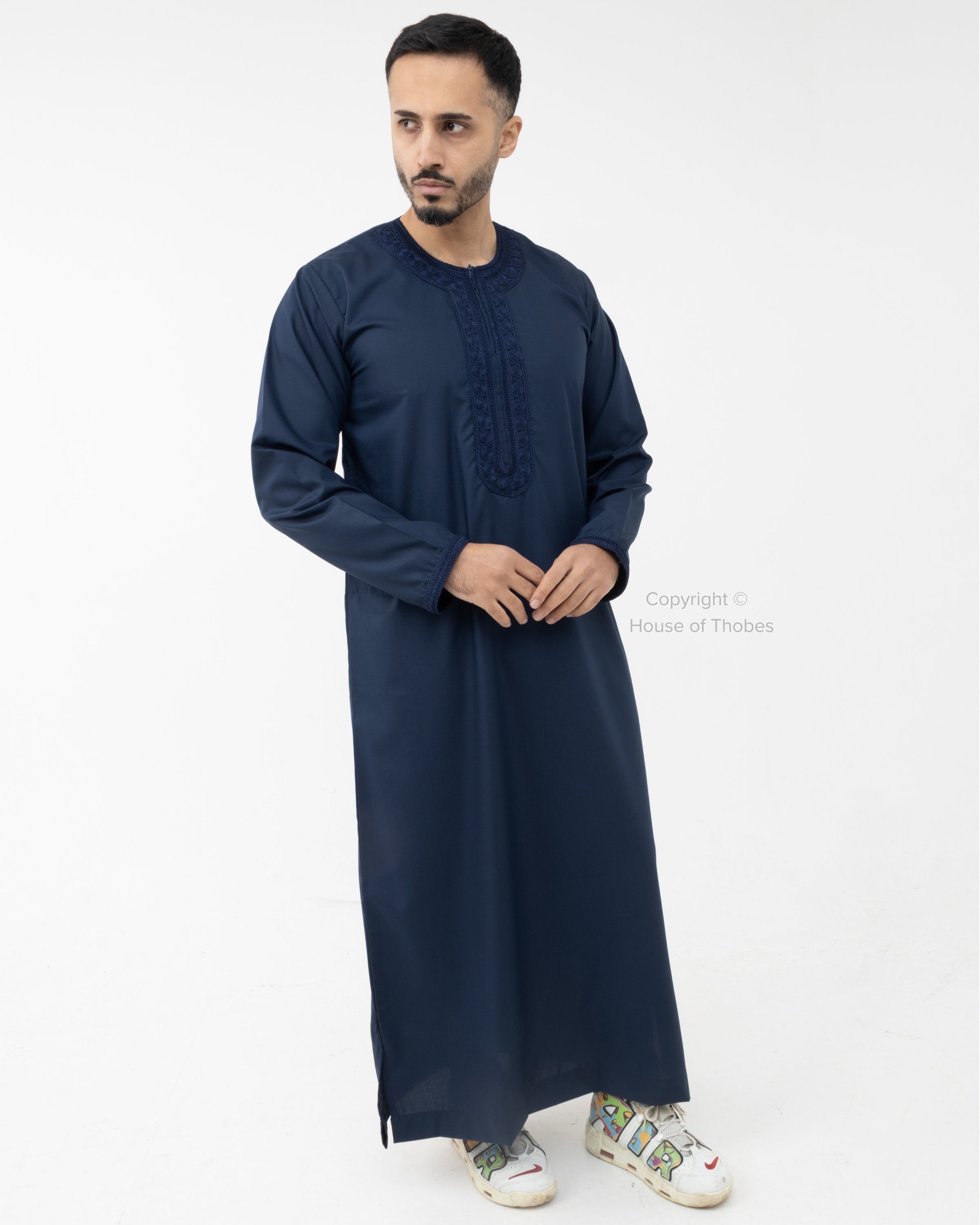 Luxury Navy Moroccan Kaftan Gandoura with long sleeves and two side pockets for practicality. Features a chest zip for easy wear. Made from a comfortable polyester viscose blend. Check the size guide for the perfect fit, and note that colours may vary slightly due to lighting and varying screen resolutions etc.
