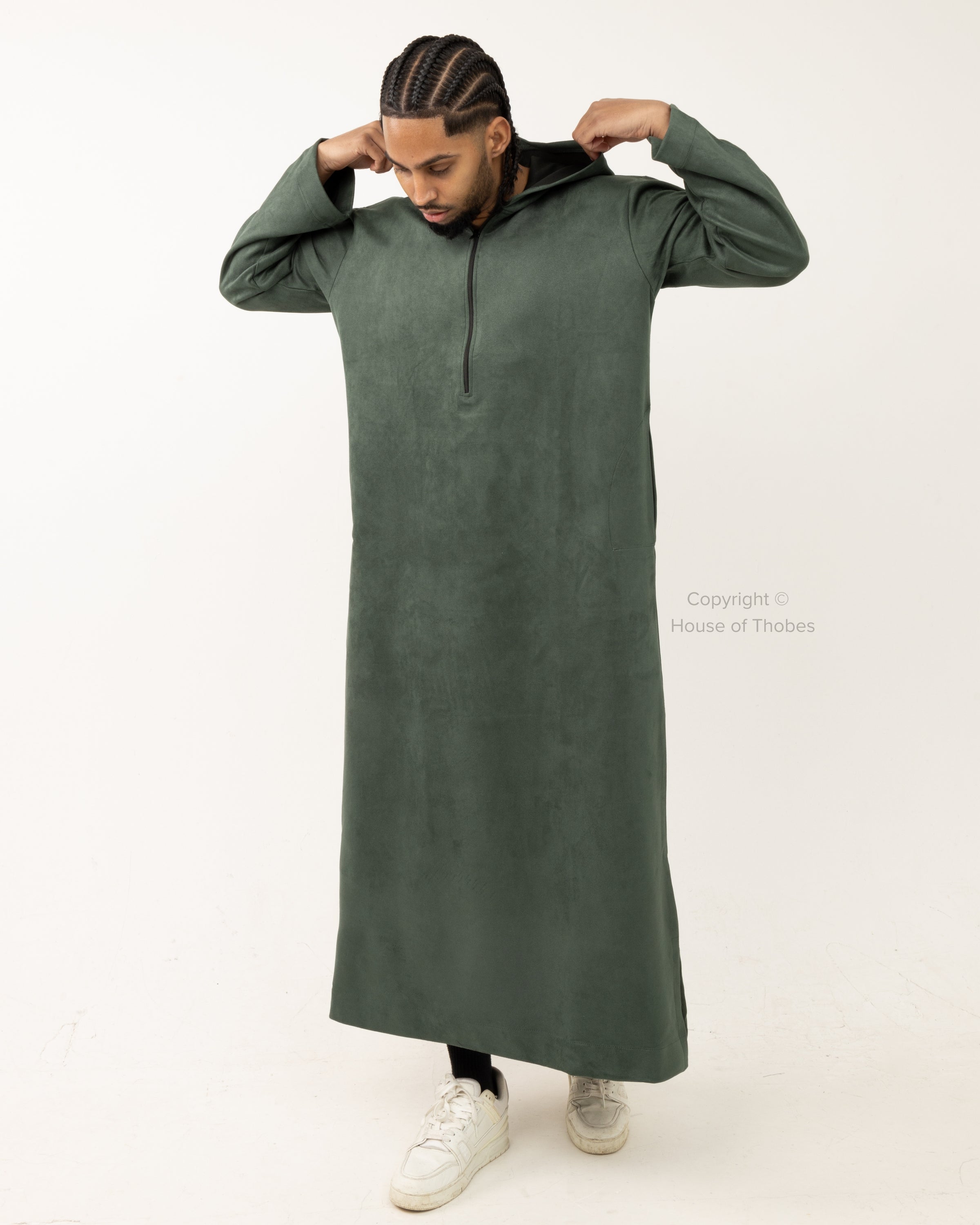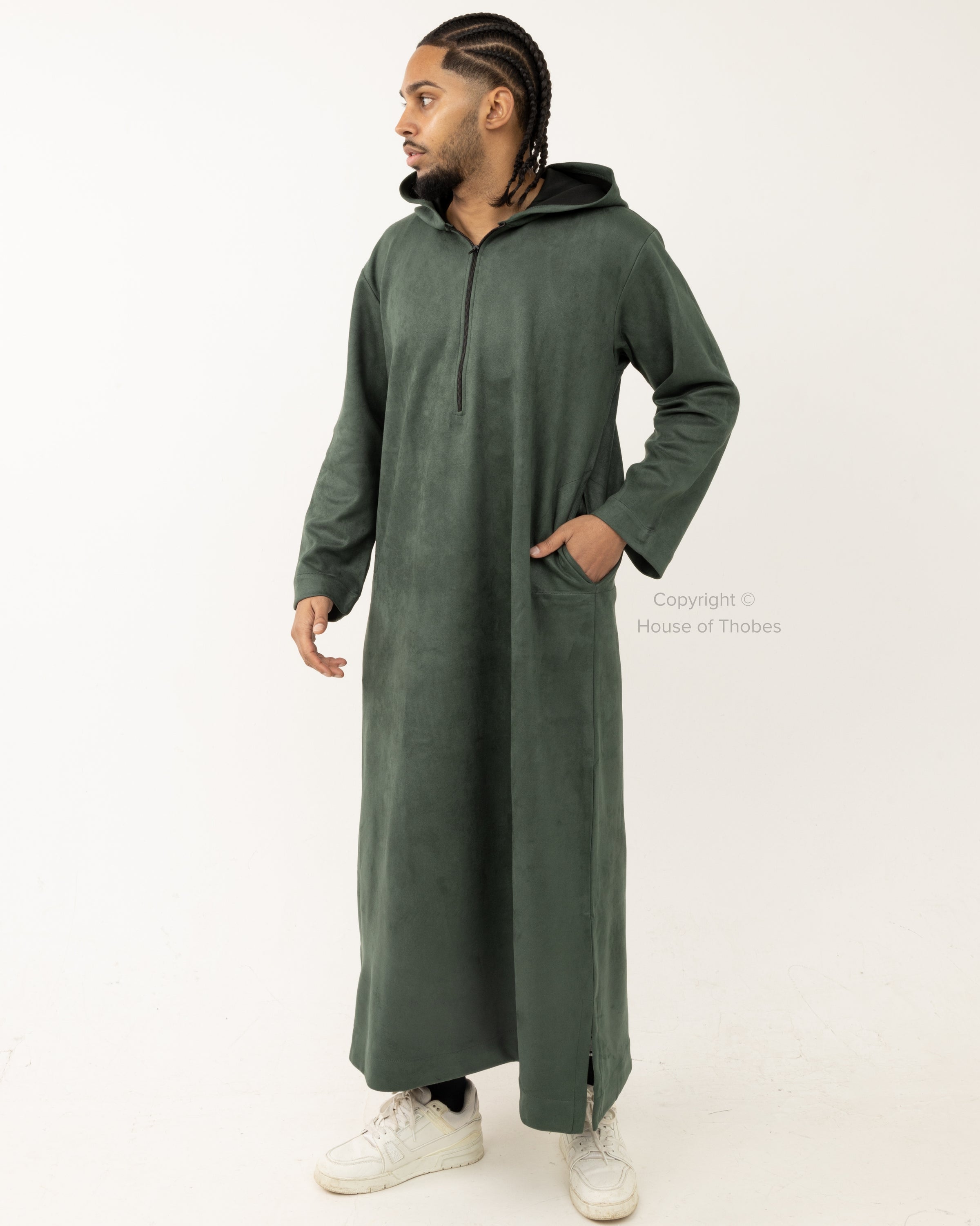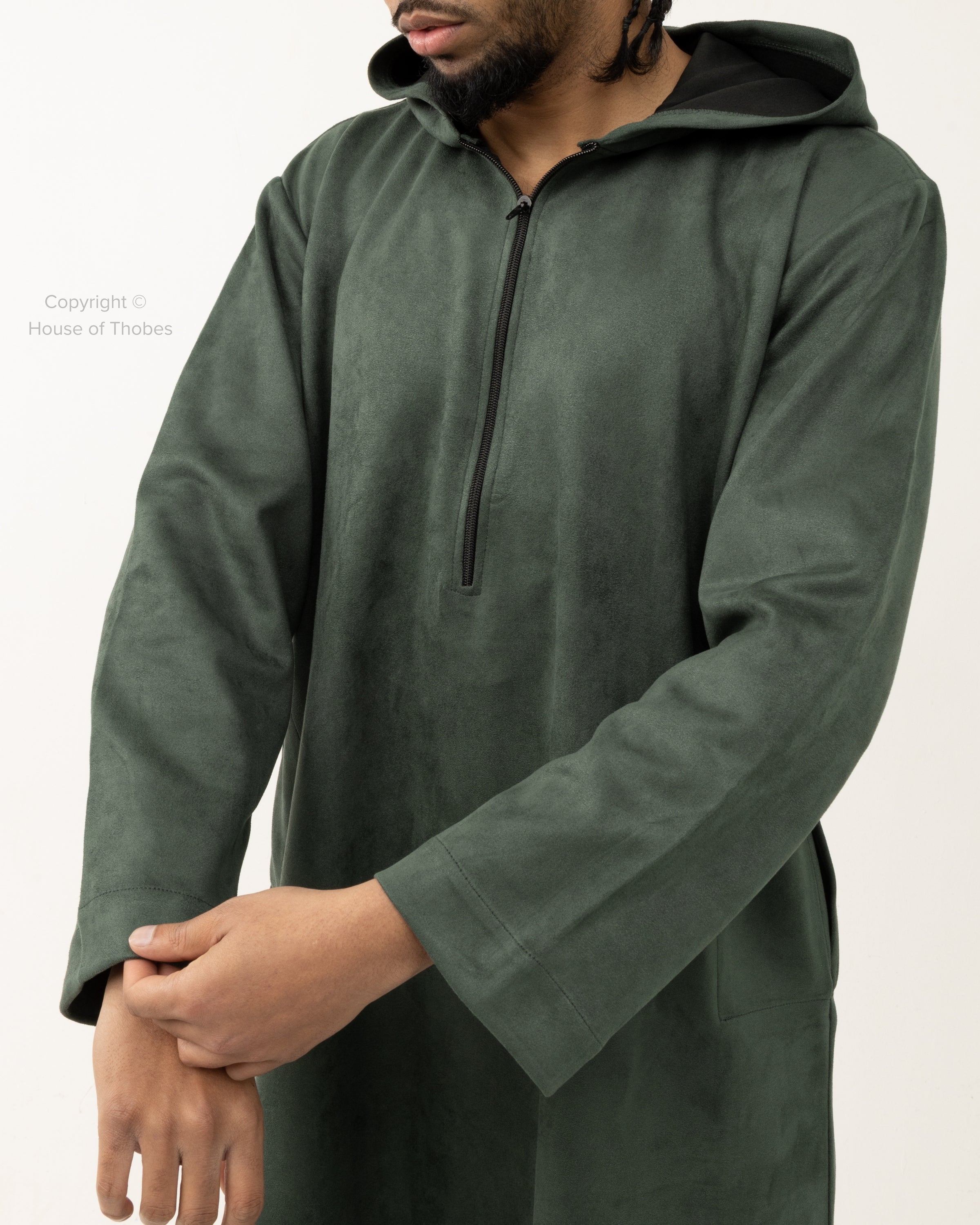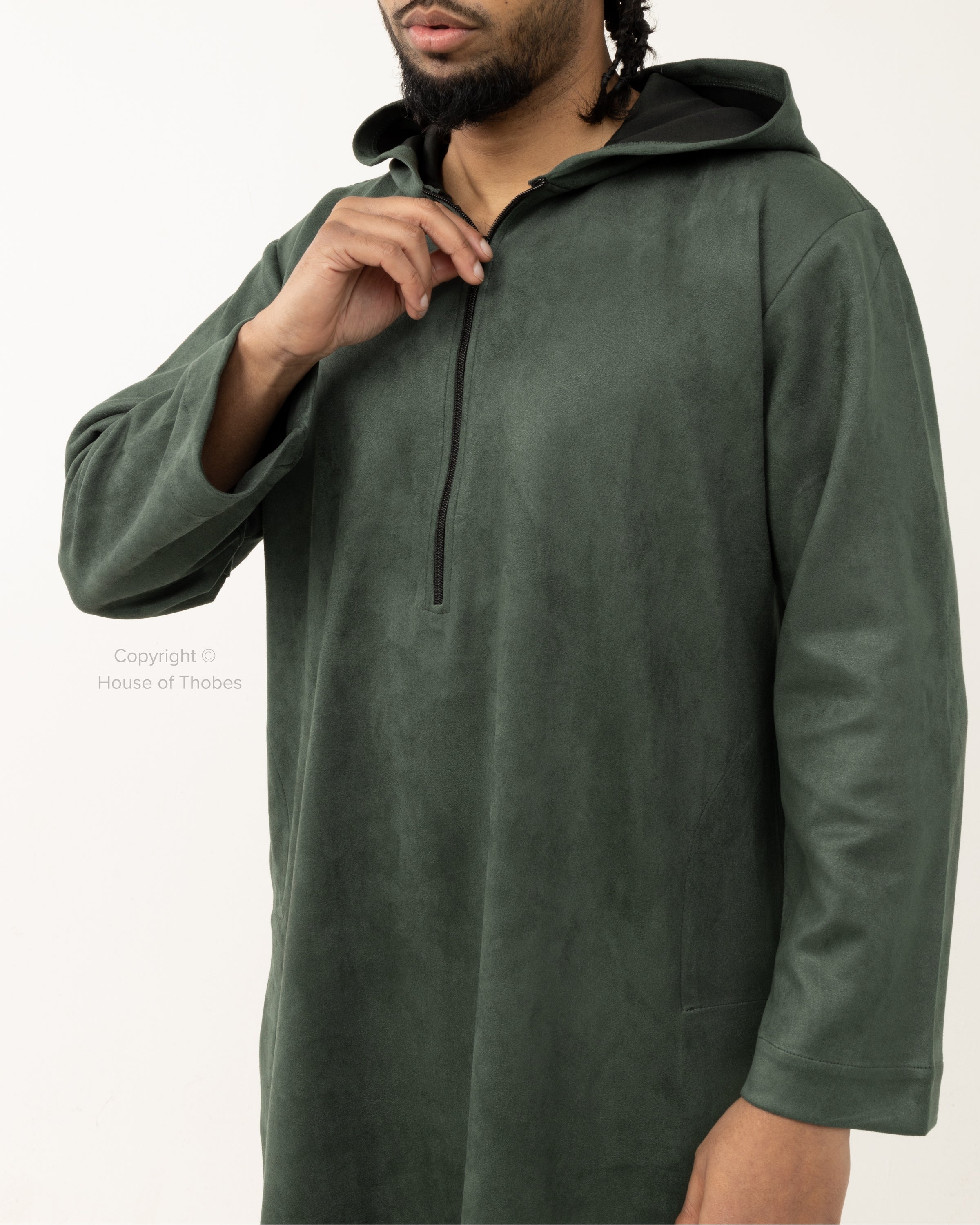 Green suede thobe with a hooded design and loose fit. Includes a chest zip and two practical side pockets. Made from polyester blend fabric. Refer to our Size Guide for the best fit.